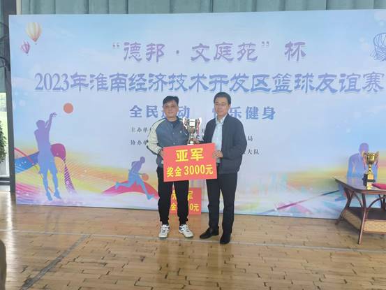 在比賽過程中,各參賽隊伍秉承“友誼第一、比賽第二”的原則,充分展現了“更高、更快、更強”的體育精神。他們在賽場中頑強拼搏,奮力爭先,以高昂的斗志,高超的球藝,賽出了風格,賽出了水平,賽出了友誼。經過五天的激烈角逐,安徽德邦籃球隊在小組賽中以第一名的成績出線,并在422日的總決賽中獲得亞軍。淮南市經開區黨工委委員、紀檢工委書記朱英魁、安徽德邦化工有限公司黨總支書記劉默海為獲獎隊伍頒發獎杯和獎金。